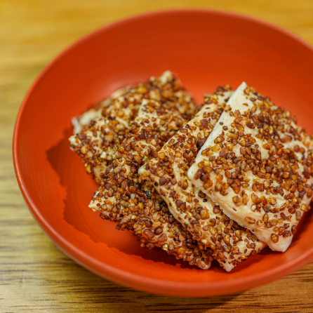 細かく砕いた、風味が豊かな蕎⻨の実を加え、蕎麦粉で焼き上げたそばクッキー層です。